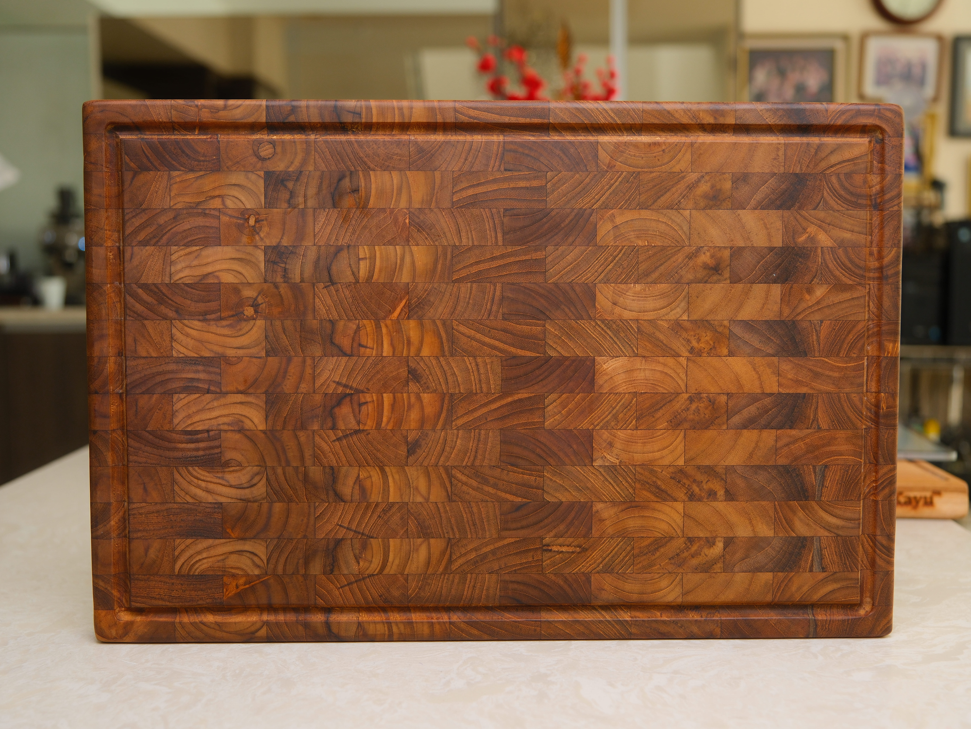 Teak is one of the densest, most oil-rich hardwoods on earth. Its natural silica content makes it highly resistant to moisture, bacteria, and warping — all critical properties for a cutting board. Combined with end grain construction, which lets knife edges slide between wood fibres rather than cutting across them, our boards are among the most knife-friendly surfaces you can use.
